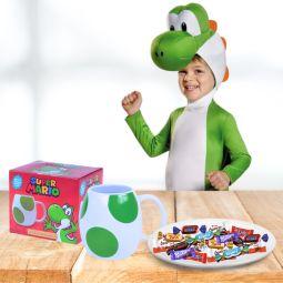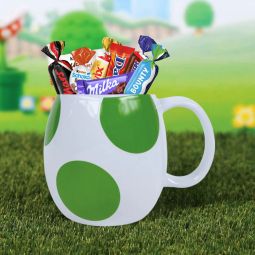 Coffret mug en céramique 3D (50cl) - Oeuf de Yoshi garni de 20 chocolats multi-variétés : Snickers, Mars, Twix, Bounty, Daim, Kinder Schokobons, Kinder mini Bueno, Milka nature Produit sous licence officielle
