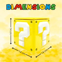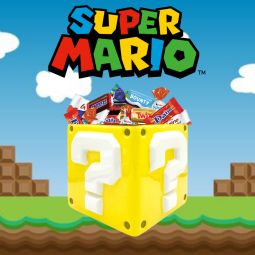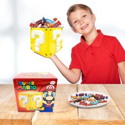 Cube en céramique 14 x 14 cm rappelant le bloc point d'interrogation du célèbre jeu vidéo, garni de 100 chocolats Miniature Mix, Daim, Kinder Schokobons et mini Bueno Produit sous licence officielle