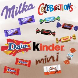 Boite à dosettes garnie de 30 chocolats assortis : Schokobons, mini bueno, Célébrations, Milka assortis. Dimensions : 18x8 cm.