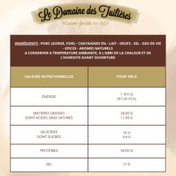 Savourez l’authenticité d’une terrine de campagne généreuse, sublimée par la douceur des châtaignes. Bocal 180 g