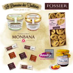 Ce joli coffret en forme orné de son ruban satin, est parfait pour enchanter les papilles des plus gourmands ! Prêt à offrir, il est garni de 2 terrines 180g, 1 barquette salés persillade 75g, 1 confiture Pêche Melba 20g et 16 chocolats et nougats.