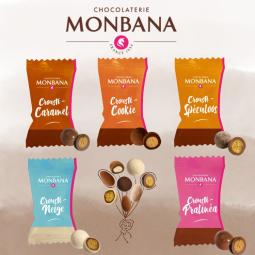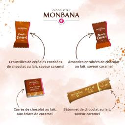 Sachet garni de 50 pièces - 4 variétés Monbana : carré lait caramel, stick 1934 caramel, crousti-caramel, amande caramel - Emballé individuellement