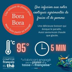 Infusion de fruits Bora Bora - Infusion aux notes exotiques agrémentée de fraise et de pomme. Une délicieuse boisson qui évoque le paradis. Aussi savoureuse chaude que glacée. À infuser pendant 5 minutes à 95°C