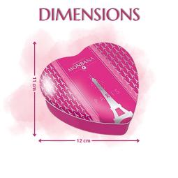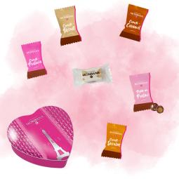 Boîte Cœur Paris garnie de 20 délices : biscuits MONBANA®, nougat et croustilles en chocolat multi-variétés. Un assortiment gourmand idéal à offrir ou à partager !