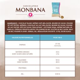 Crousti-neige MONBANA 2.5 g : Bille de céréales au chocolat au lait recouverte de chocolat blanc. Emballé individuellement