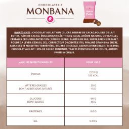 Crousti pralinéa MONBANA 2.5 g : Bille de céréales enrobées de chocolat au lait praliné saupoudré de chocolat amer. Emballé individuellement