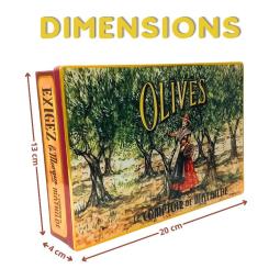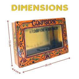 Boite métal "Le comptoir de Mathilde" garni de 30 papillotes assorties : pâtes de fruits abricot, fraise, poire et pralinés lait céréales croustillantes, chocolat double praliné noisette. Dimensions : 13x4x20 cm. 800 points