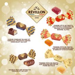 Boite "Le comptoir de Mathilde" garni de 30 papillotes assorties : pâtes de fruits abricot, fraise, poire et pralinés lait céréales croustillantes, chocolat double praliné noisette. Dimensions : 13x4x20 cm. 800 points