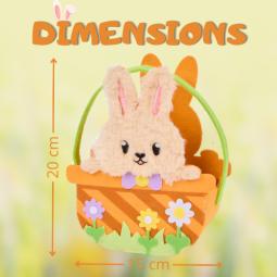 Panier feutrine lapin doux et coloré garni d'un sachet de 35 chocolats REVILLON et ROHAN : petits œufs 8gr Révillon, petits lapins croustillant lait, petits poussins 5gr, oeufs 18gr. Dimensions : 20 x15 cm