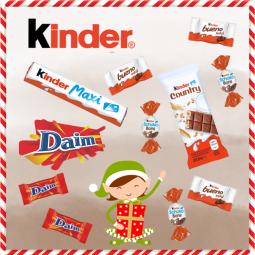 Boite en carton Joyeux Noël garnie de 25 Kinder Schokobons, 25 Kinder Mini-bueno + 1 Moulage Père Noel 30g (10 cm). Dimensions : 12x12x12 cm