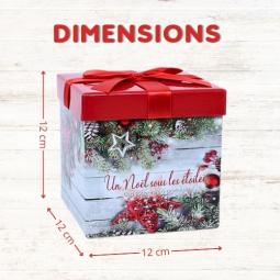 Lot de 2 petites boites carrées 6x6 cm avec ruban rouge garnie de 7 chocolats multi-variétés chacune : Daim, Kinder Schokobons, Kinder mini-bueno, Mini Snickers, Mini Twix, Mini Bounty, Mini Mars.. Collection "Noël sous les étoiles"