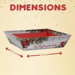 Boite gourmande 19 cm de diamètre emballée de papier cristal. Elle est composée de : 1 infusion Fruits de Noël Comptoir Français du Thé 20g, 1 tasse avec anse, 1 boule à thé avec pince, 6 spéculoos Monbana, 2 madeleines, 12 papillotes assorties.