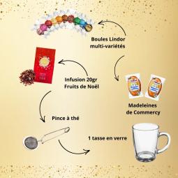 Petite corbeille 15x15 cm emballé de papier cristal - prête à offrir Corbeille garnie d'1 infusion de fruits de Noël 20g Comptoir Français du Thé, 1 pince à thé, 2 madeleines, 10 chocolats Lindor et 1 mug en verre avec anse.