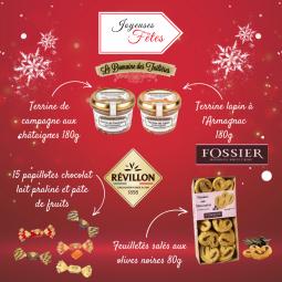 Offrez un instant de plaisir gourmet avec ce coffret festif alliant 1 feuilleté salé aux olives noires 80g Fossier, 1 terrine campagne aux cèpes et 1 terrine lapin à l'Armagnac 180g, 15 papillotes pralinés et pâtes de fruits. Dimensions : 22x10x22 cm