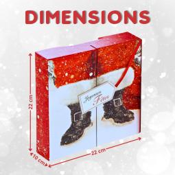 Ballotin Joyeux Noël garni de 85 chocolats de Noël : Papillotes Révillon pralinés et fruits, petit moulage Père Noël 5g, moulage tête de Père Noël 18g, moulage Père Noël 30g, Boules pralinées, Kinder Schokobons, Mini-bueno et Daim.