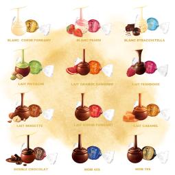 Ballotin plaisir d'offrir 20x12 cm garni de 60 papillotes assorties : céréales croustillantes chocolat au lait, double praliné noisette, chocolat au lait, pâtes de fruit abricot, fraise et poire.