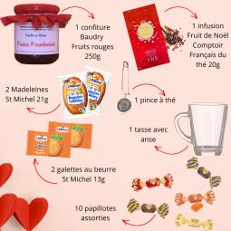 Coffret en forme de coeur 20x22 cm garnie : 1 confiture BAUDRY fruits rouges 250g, 2 madeleines ST MICHEL 21g, 2 galettes au beurre ST MICHEL 13g, 10 papillotes, 1 infusion COMPTOIR FRANÇAIS DU THÉ "Fruits de noël" 20g, 1 pince à thé, 1 tasse.