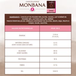 Boisson onctueuse au chocolat Monbana tradition salon de thé. Nous vous conseillons de dissoudre la poudre dans du lait ou de l'eau chaude. Boisson onctueuse. 20 sticks ou 50 sticks de 20gr