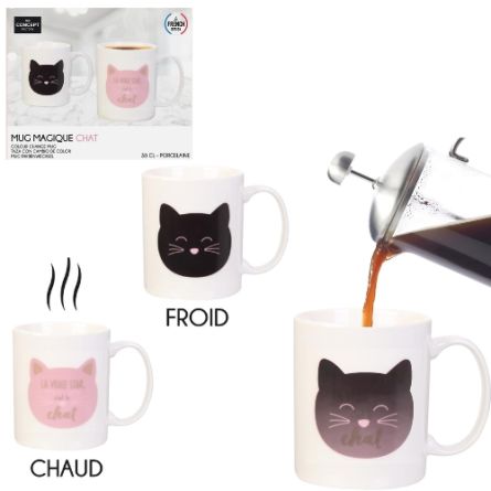Apportez une touche de magie et de gourmandise à vos pauses avec ce mug thermique en forme de chat, au design ludique et coloré. Grâce à sa technologie thermique, ce mug change de couleur au contact de boissons chaudes et révèle un message surprise, pour un moment unique à chaque gorgée.