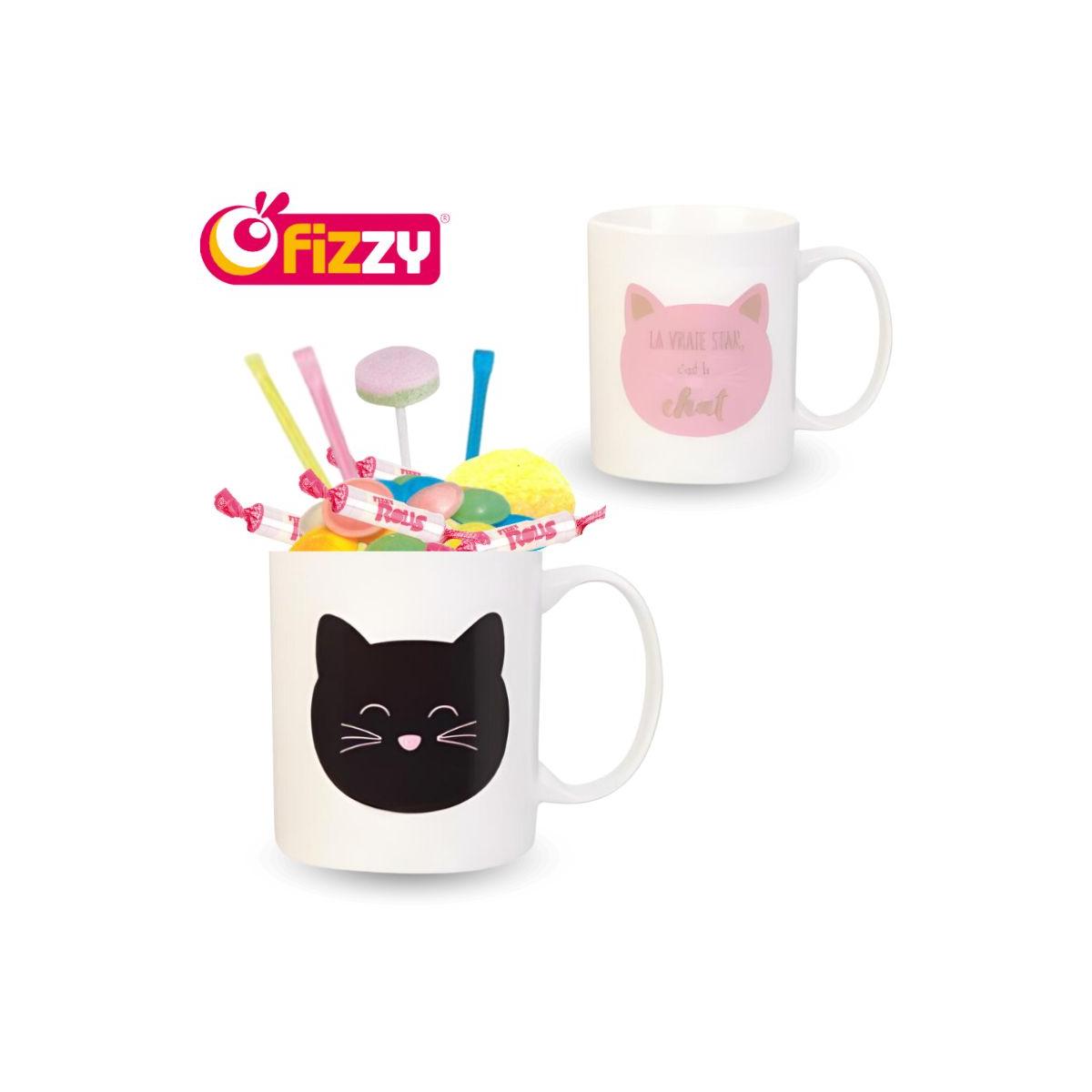 Mug thermique chat rempli de 20 bonbons au dextrose (boules coco, colliers, rolls, sucettes…).