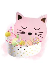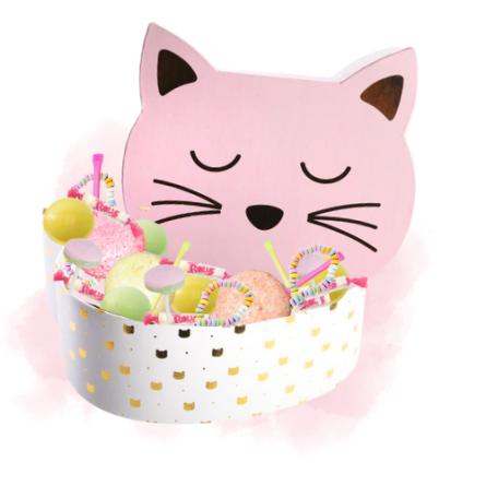 Boite de rangement en forme de tête de chat garnie de 100 bonbons dextrose et acidulés : sucettes, colliers, rolls dextrose, soucoupes, pailles acidulées et boules coco.