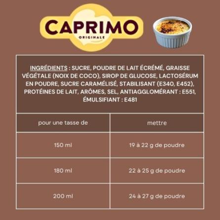 Ce produit contient déjà du lait. Le cappuccino CAPRIMO peut être utilisé manuellement en suivant ce conseil de préparation ou dans un distributeur automatique qui assurera le parfait dosage de votre boisson.