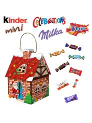 Maisonnette tirelire garnie de 30 chocolats multi-variétés : Kinder Schokobons, Mini Bueno, Milka, Daim, Mini Mars, Mini Twix...
