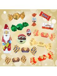 Boite en carton Joyeux Noël garni de 50 chocolats : Papillotes Révillon pralinés et fruits, petit père noël 5g, tête de père noël 18g, moulage Père Noel 30g, Kinder Schokobons, Kinder Mini-Bueno, Daim, Boules pralinées..