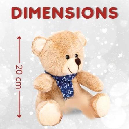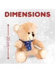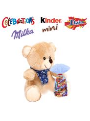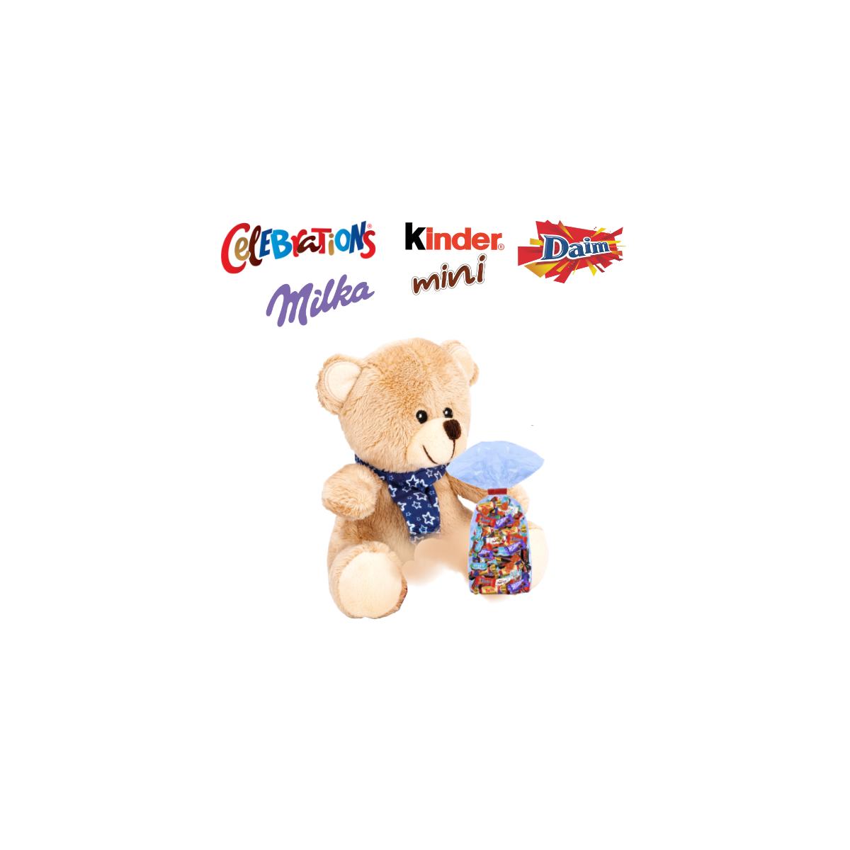 Peluche 20 cm accompagnée d'un sachet de 20 chocolats assortis : Kinder Schokobons, Mini Bueno, Daim, Milka nature, Mini Mars, Mini Twix, Mini Snickers, Mini Bounty..