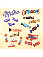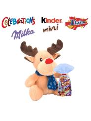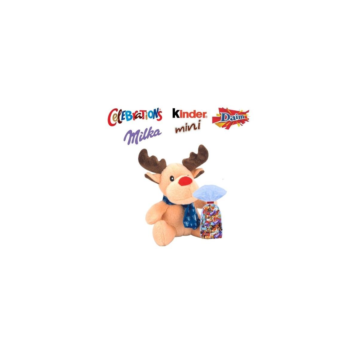 Peluche 20 cm accompagnée d'un sachet de 20 chocolats assortis : Kinder Schokobons, Mini Bueno, Daim, Milka nature, Mini Mars, Mini Twix, Mini Snickers, Mini Bounty..
