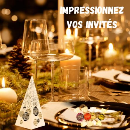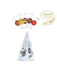 Pyramide en carton au décor de Noël garnie de 5 chocolats Lindor chacune.