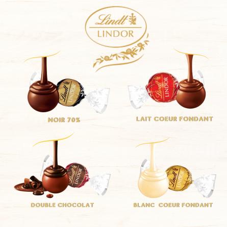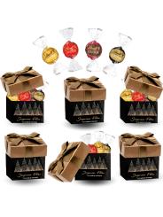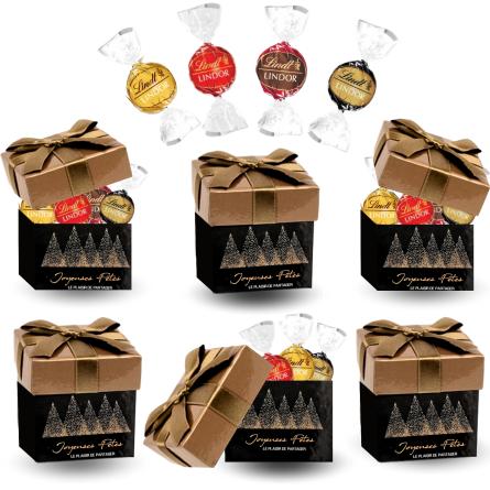 Petites boites carrées 6x6 cm avec ruban garnies de 4 chocolats Lindor chacune : noir 70%, lait coeur fondant, double chocolat, blanc coeur fondant.