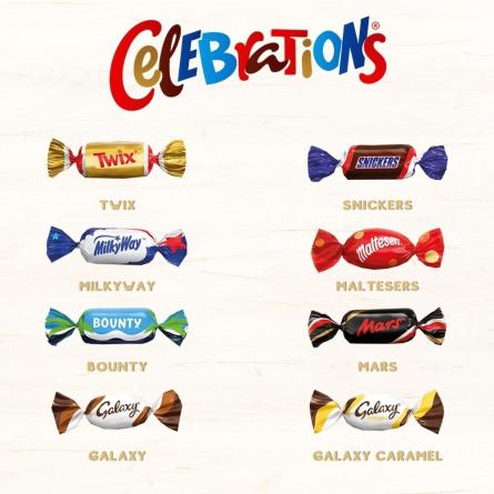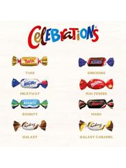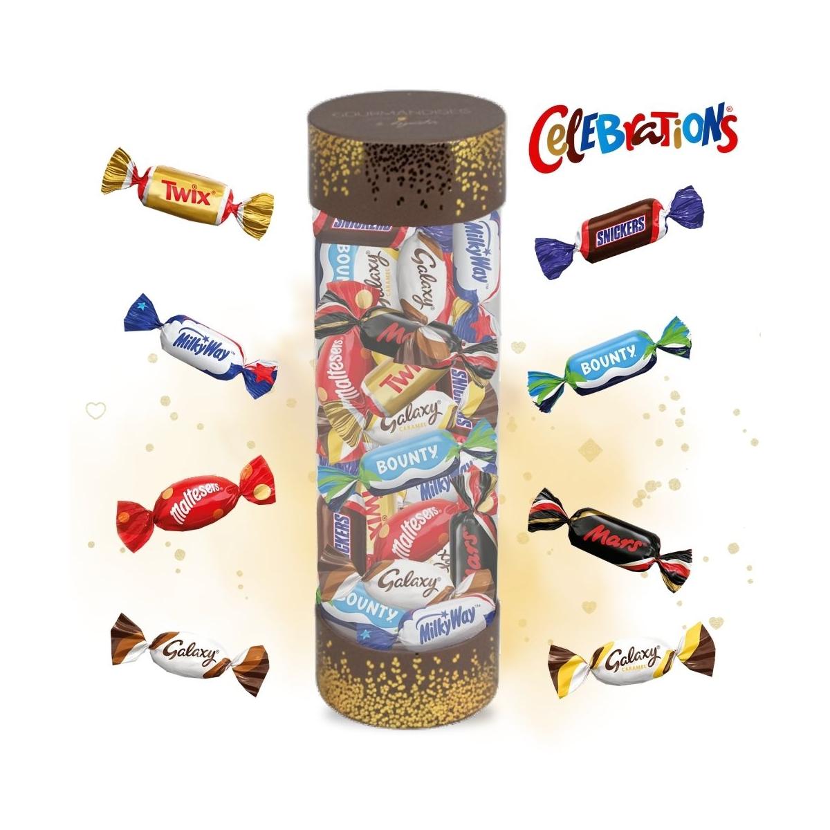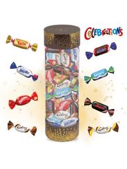 Ce joli tube doré est garni d'un assortiment de 30 chocolats Célébrations assortis : Mars, Snickers, Twix, Bounty, Milkyway, Maltesers, Galaxy..