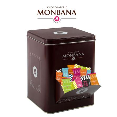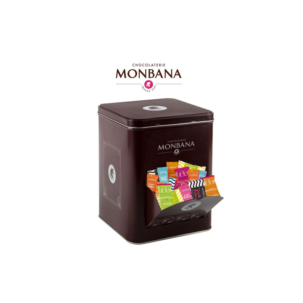 Boite métal distributrice Monbana garnie de 150 biscuits et chocolats : crousti-neige, crousti pralinéa, crousti spéculoos, crousti caramel, crousti cookie, biscuit spéculoos, galette citron, galette bretonne, mini cookie.