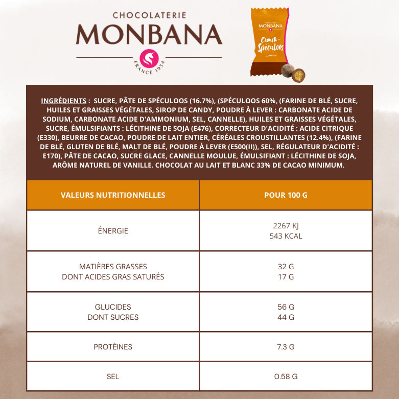 Depuis 1934, la chocolaterie MONBANA®, fondée en France, est un expert reconnu du chocolat en poudre, des accompagnements café et des friandises chocolatées. Forte de près d’un siècle d’expérience, chaque création MONBANA® garantit qualité, saveur et plaisir gourmand. Le Crousti Spéculoos incarne parfaitement cette tradition : une bouchée croquante, un enrobage onctueux de chocolat au lait et un cœur fondant au spéculoos délicatement épicé.