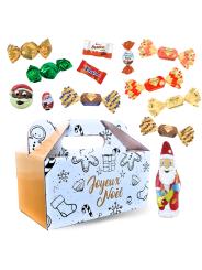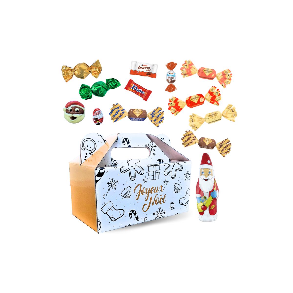 Ballotin Joyeux Noël garni de 85 chocolats de Noël : Papillotes Révillon pralinés et fruits, petit moulage Père Noël 5g, moulage tête de Père Noël 18g, moulage Père Noël 30g, Boules pralinées, Kinder Schokobons, Mini-bueno et Daim.