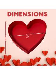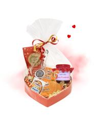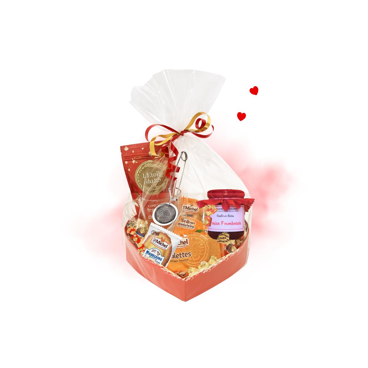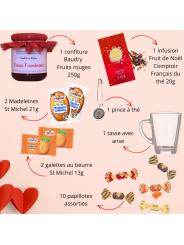 Coffret en forme de coeur 20x22 cm garnie : 1 confiture BAUDRY fruits rouges 250g, 2 madeleines ST MICHEL 21g, 2 galettes au beurre ST MICHEL 13g, 10 papillotes, 1 infusion COMPTOIR FRANÇAIS DU THÉ "Fruits de noël" 20g, 1 pince à thé, 1 tasse.