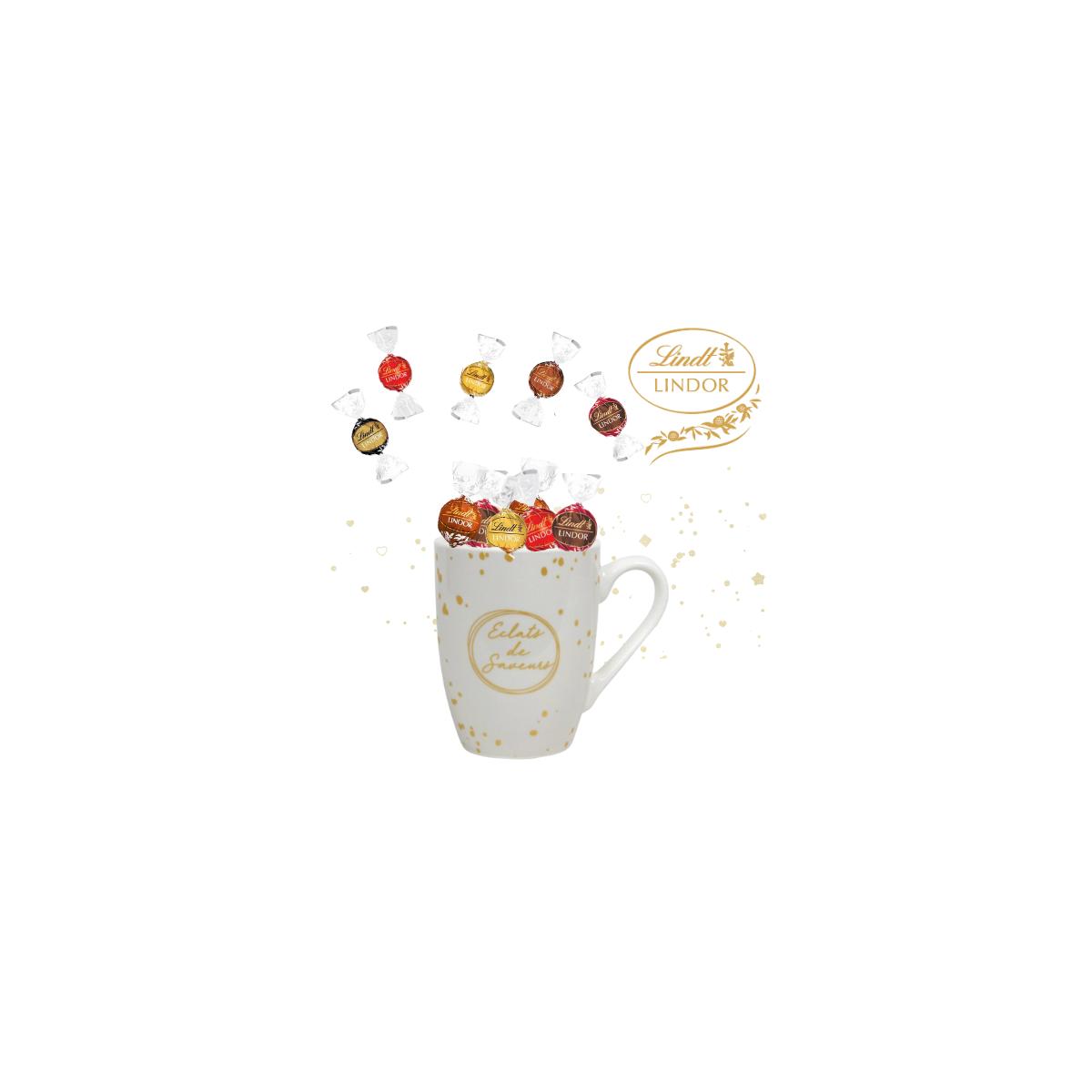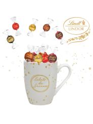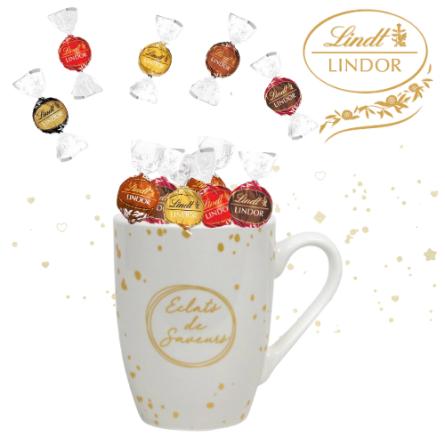 Mug collection "Eclats de saveurs" 32 cl garni de 15 Lindor - 5 variétés : noir 70%, double chocolat, lait coeur fondant, lait noisette, blanc coeur fondant.