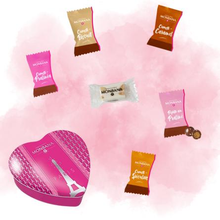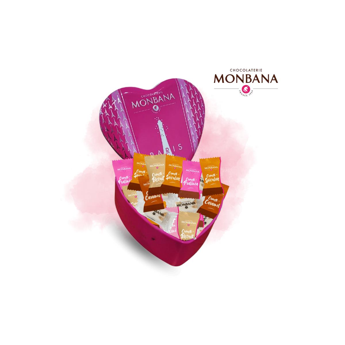 Boîte Cœur Paris garnie de 20 délices : biscuits MONBANA®, nougat et croustilles en chocolat multi-variétés.