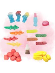 Un assortiment coloré et fruité comprenant des incontournables comme Schtroumpfs, bouteilles Coca, bananes et bien d’autres douceurs signées Haribo, Lutti et Fini.