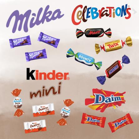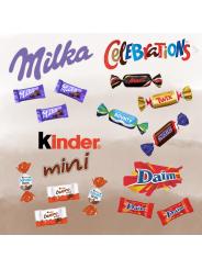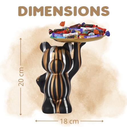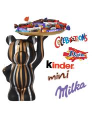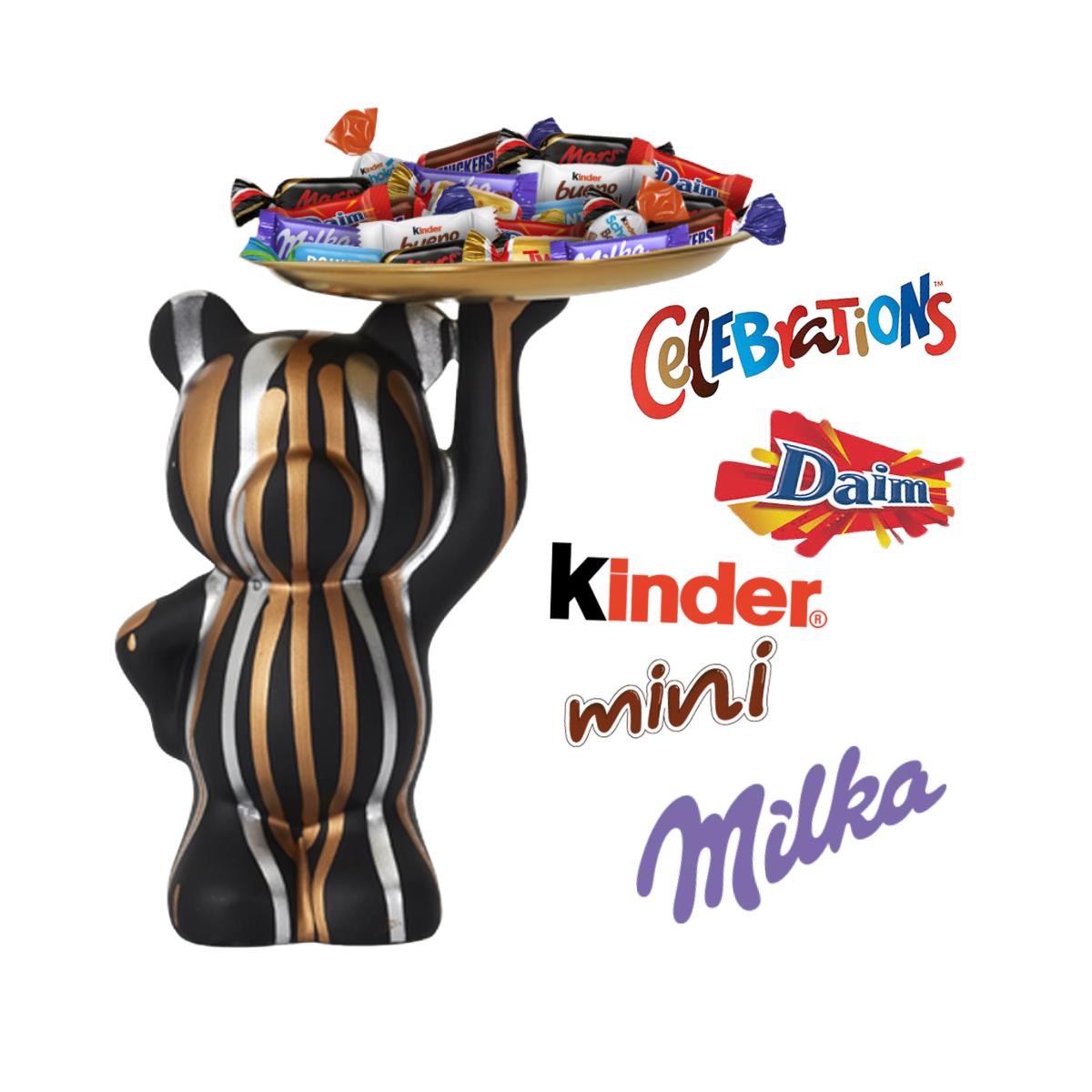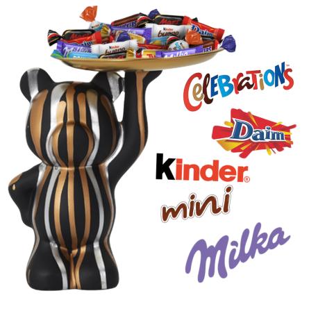 Statue ours noir garni d'un assortiment de 20 chocolats multi-variétés : Kinder Schokobons, Kinder Mini Bueno, Daim, Milka nature, Mini Mars, Mini Twix, Mini Snickers, Mini Bounty..