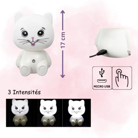 Ajoutez une touche de fantaisie à votre enfant avec cette veilleuse chat lumineuse. Sa lumière douce rassure au moment du coucher. Dotée de 3 intensités et d’un port micro-USB, elle accompagne l’enfant vers des nuits paisibles