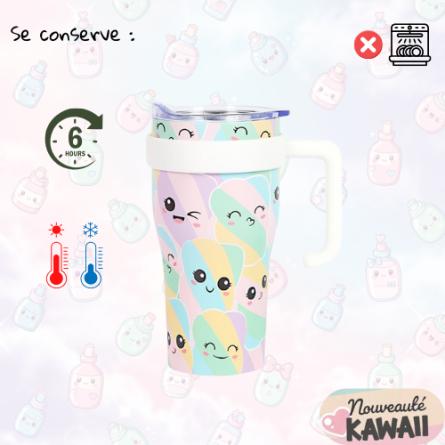 Boostez vos pauses café ou thé avec le Mug Kawaï ! 💖 Avec sa capacité Mini de 60 cl, restez hydraté ou profitez de votre boisson préférée sans refaire le plein. Son acier inoxydable ultra-résistant garde vos boissons chaudes jusqu’à 6 h ☕ ou fraîches toute la journée 🧊, idéal pour café, thé, latte ou eau aromatisée.