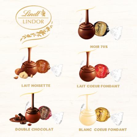 Lindor Double Chocolat Ingrédients : Sucre, matières grasses végétales (coprah, palmiste), beurre de cacao, pâte de cacao, poudre de lait, lactose, beurre laitier concentré, lécithine de soja, extrait de malte d'orge, arômes, sel. Allergènes : Lait, soja. Peut contenir des noisettes et autres fruits à coque. Spécificités : Cacao 45% (noir) / 32% (lait). Matière sèche de lait : 21% minimum.