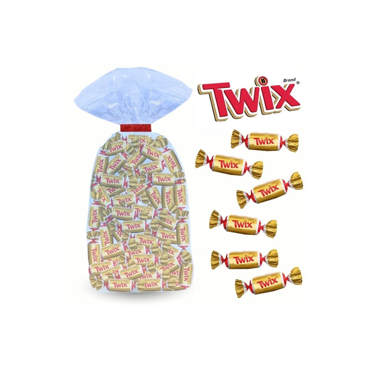 Sachet Twix Minis 620g avec environ 60 chocolats individuels alliant biscuit croustillant, caramel fondant et chocolat au lait.