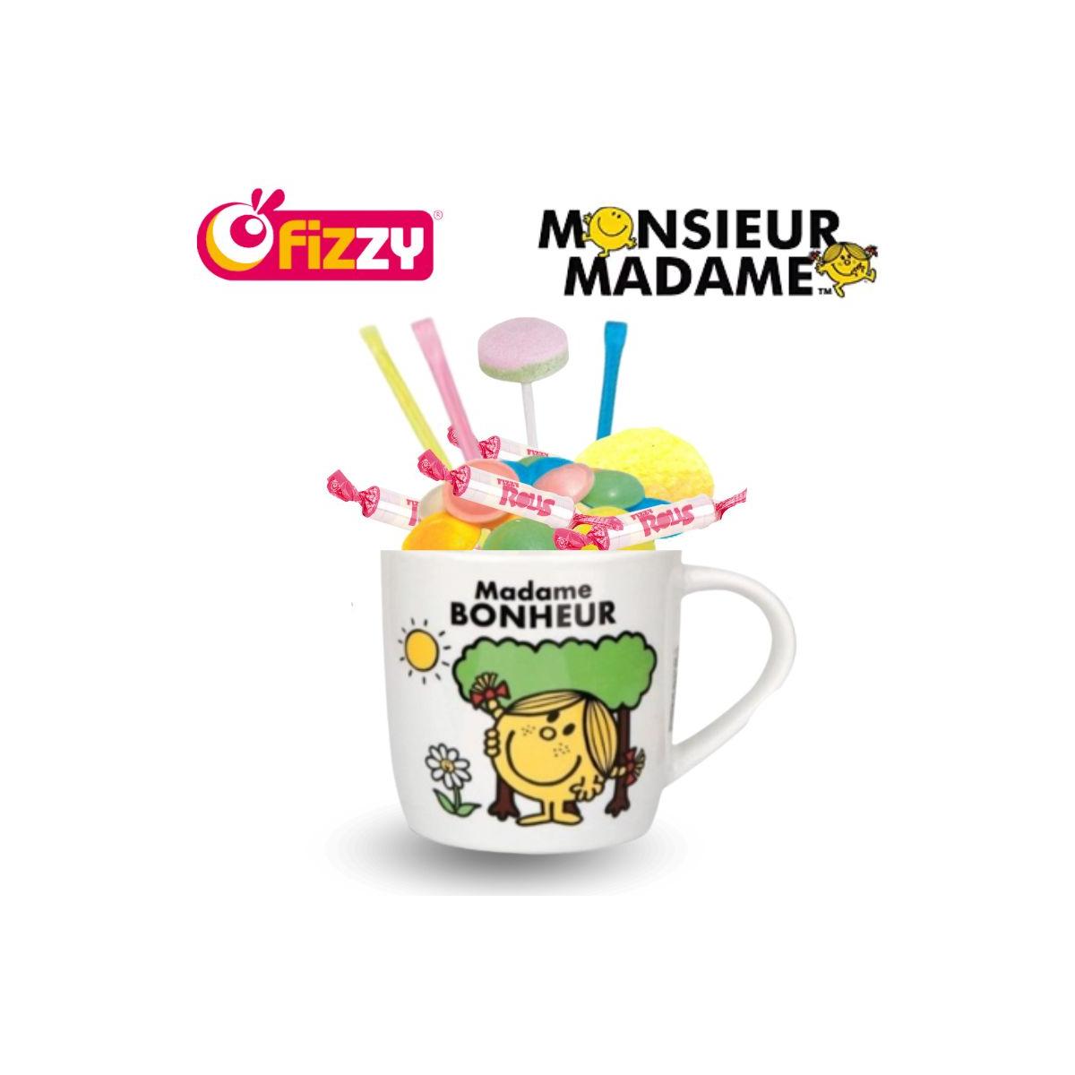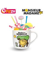 Mug 25 cl Madame Bonheur inspiré de l’univers Monsieur Madame, accompagné de 20 bonbons au dextrose (boules, colliers, rolls, sucettes, soucoupes).