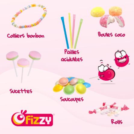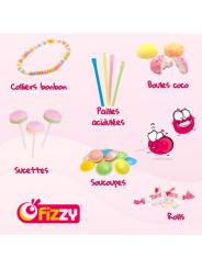 Il est accompagné de 20 bonbons au dextrose variés : boules, colliers, rolls, sucettes et soucoupes, pour un instant sucré et convivial.