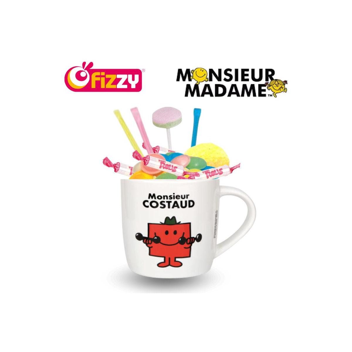 Mug 25 cl Monsieur Costaud inspiré de l’univers Monsieur Madame, accompagné de 20 bonbons au dextrose (boules, colliers, rolls, sucettes, soucoupes).