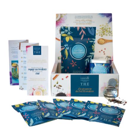 Découvrez le coffret Chaï Merveilleux : thé noir, 5 épices, cuillère Matriochka, boîte « ma création » et guide recette pour créer vos infusions uniques.