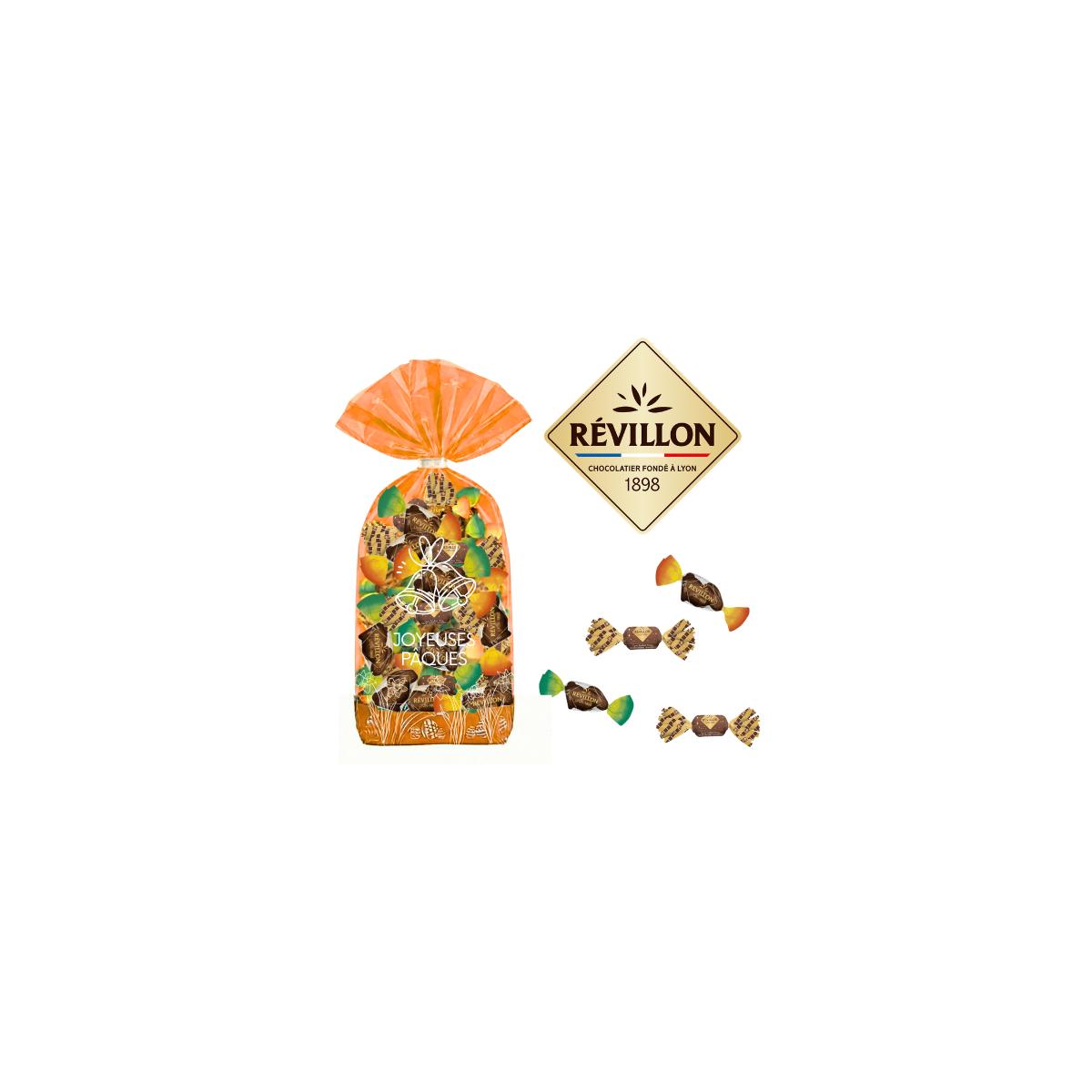Assortiment de 15 chocolats de Pâques REVILLON : mini lapins en chocolat au lait, lapins fourrés caramel et délicieuses papillotes praliné.